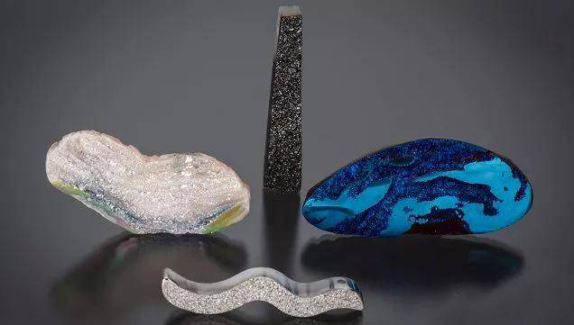 ↑↑↑这组玛瑙晶簇展示了各种涂层效果。左起:二氧化硅涂层、黑色钛涂层、蓝色钛涂层和铂金涂层。由 Rare Earth Mining Co. 友情提供 摄影:Robert Weldon(罗伯特·韦尔登)/GIA