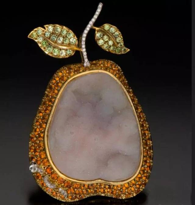 ↑↑↑Ricardo Basta(里卡多·巴斯塔)采用玛瑙晶簇、钻石、锰铝榴石及绿榴石打造了这款精美的梨形胸针。由 Ricardo Basta(里卡多·巴斯塔)友情提供。摄影:Robert Weldon(罗伯特·韦尔登)/GIA