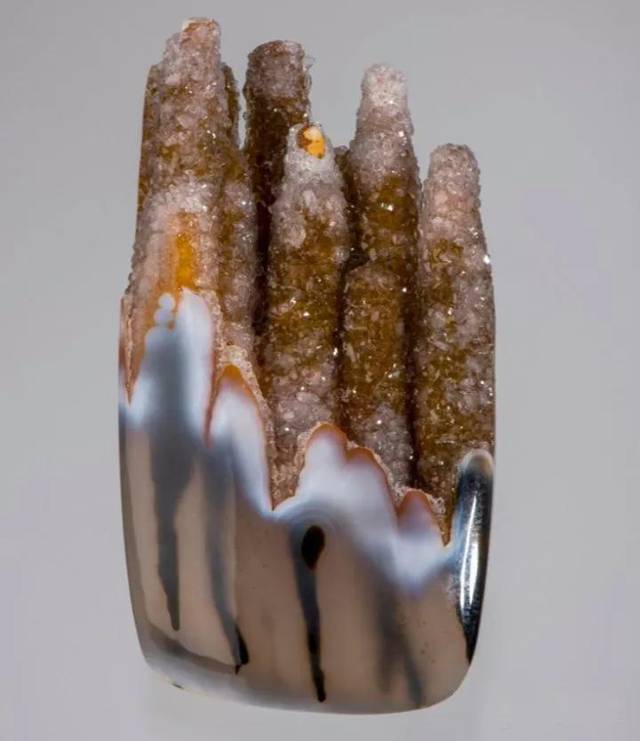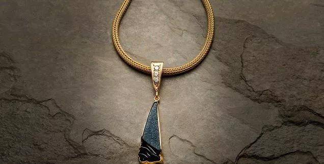 ↑↑↑这颗雕刻黑色条纹玛瑙吊坠的表面闪烁着天然晶簇晶体,由 Glenn Lehrer(格伦·莱勒)雕刻。由 Rebecca Young Buys(丽贝卡·杨·拜斯)友情提供。摄影:Orasa Weldon(奥拉沙·韦尔登)/GIA