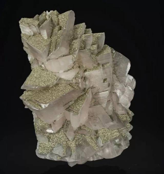 ↑↑↑俄罗斯滨海边疆区达利涅戈尔斯克的一组精美大型白色方解石晶体,表面覆盖着黄铁矿晶簇。