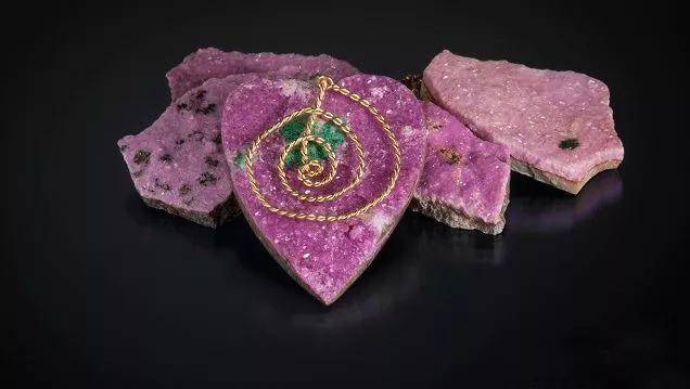 ↑↑↑这块钴方解石晶簇已被切磨成一个心形吊坠,并用18K金镶嵌着螺旋状装饰。由 Kara Ross(卡拉·罗斯)友情提供。摄影:Orasa Weldon(奥拉沙·韦尔登)/GIA