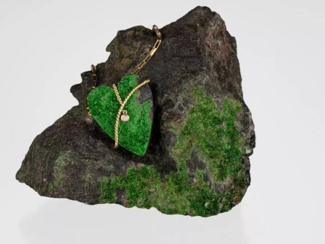 ↑↑↑这颗迷你心形吊坠由钙铬榴石晶簇制成,18K 金镶嵌,并饰有一颗钻石。由 Kara Ross(卡拉·罗斯)友情提供。摄影:Orasa Weldon(奥拉沙·韦尔登)/GIA