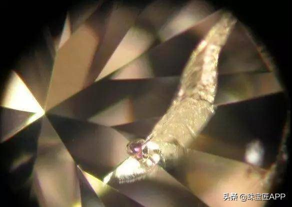 上面这张图是钻石放大以后的图片,你是否能够看到在钻石的右侧有一道形似羽毛的裂隙?