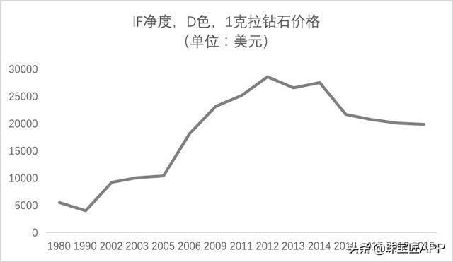 3、钻石价格为IF净度,D色,1克拉钻石的价格,来自RAPAPORT,这家公司成立于1976年,公信力全球认可,报价单分为零售、批发和集团批发三档,在用钻石做大宗交易时,以集团批发价为准兑换美金。他们从1978年开始做报价,会有一个客观的趋势图。