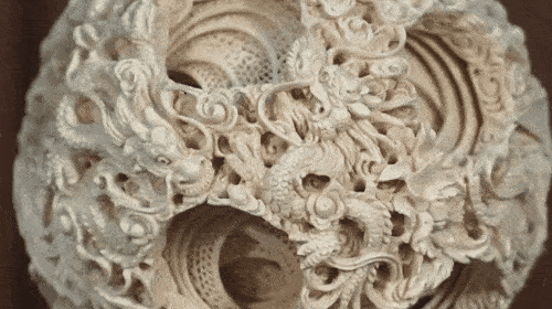 由于珠核和珠层是不同材质,在对珍珠层雕刻镂空后,整体呈现出错落的色彩,和我们国家古老的琉璃套料雕刻有异曲同工之妙。