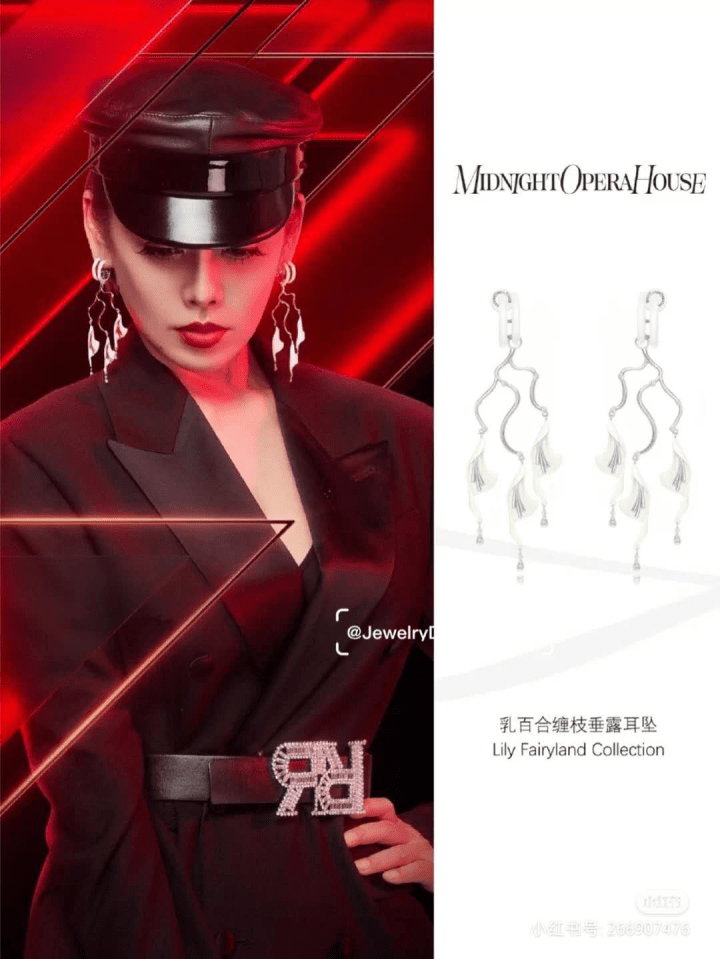 而耳朵上佩戴的这款来自Midnight Opera House的乳百合缠枝流苏耳坠,立体的百合花瓣造型,镶嵌着璀璨的晶钻,又为宁静增添了一丝女人味。