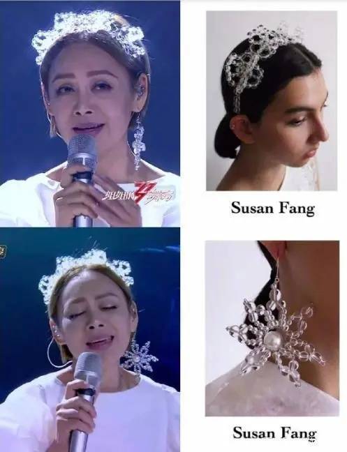 而整套穿搭的甜美秘诀,则在于她佩戴的来自华人品牌Susan Fang的水晶泡泡头箍和泡泡雪花耳饰。