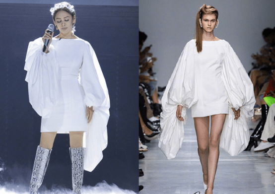 一件白色的连衣裙,夸张的灯笼袖成为了整件衣服最大的亮点,再搭配上帅气的长靴,给人一种冰雪女王的既视感。