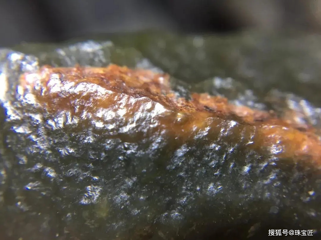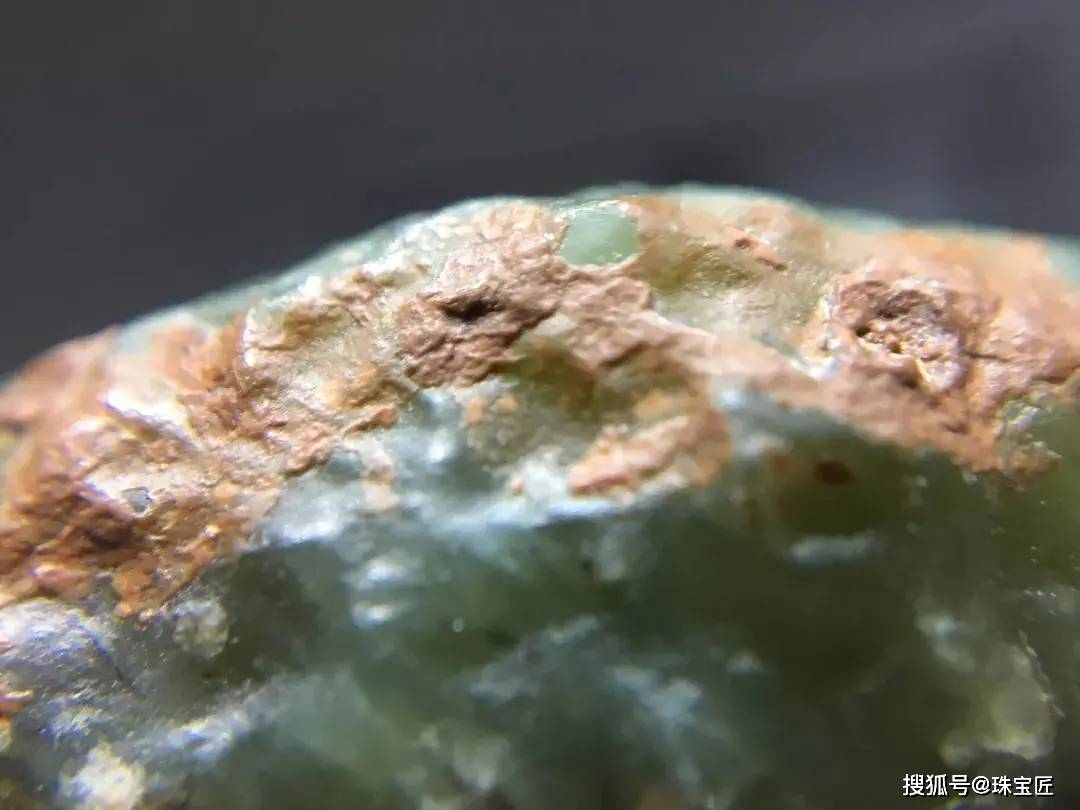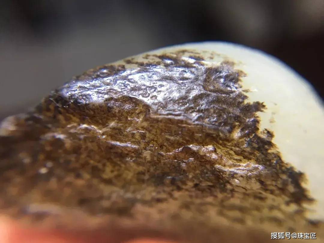 多见于黑青戈壁料的红褐色表皮,与若羌水冲料的“铁锈皮”类似,红褐色是受铁离子作用形成。