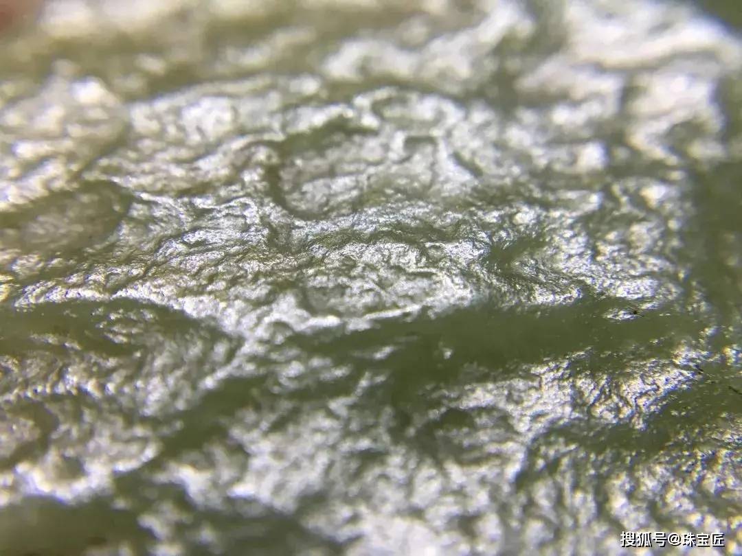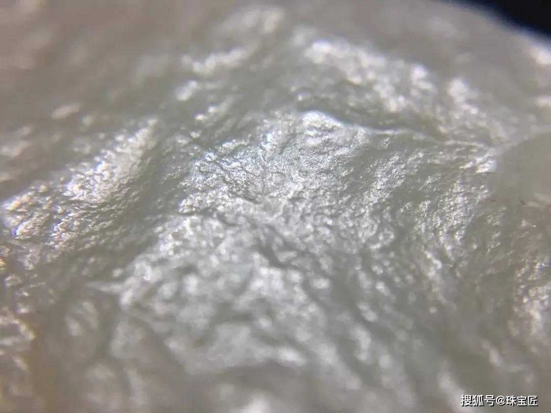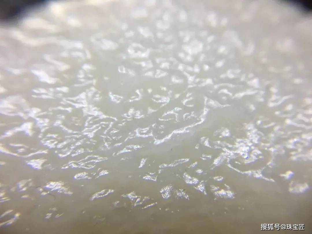 表面如柚子一般,有大块的颗粒坑洼,虽然起伏较大,但整体仍有浑然一气的油润感,柚子皮常见于若羌的青黄口之中,由于原生矿内部的水点状结构,风化之后即呈现为柚子皮。