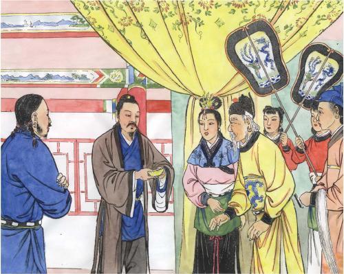 世宗贵妃听后不悦,她将一块金锭递给丘处机说:“听说道长法力高深,本宫赏你金锭一个,请将它戴在头上,如若不能,便是欺君!”