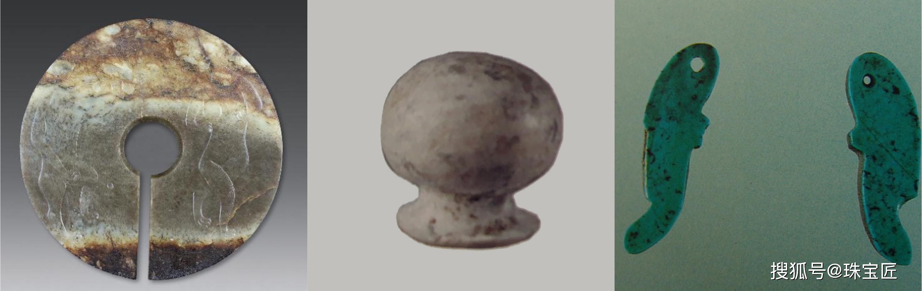 左:齐家文化 神人兽合体玉玦 中:玉耳珰 右:绿松石鱼形耳坠