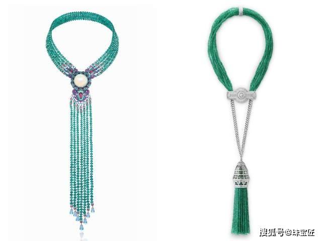 左:Red Carpet 祖母绿长项链,by Chopard;右:Verrière 钻石白金项链,by Bouchero