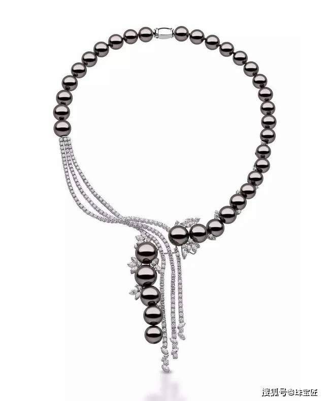 大多珍珠项链设计都是给人优雅唯美知性的感觉,但下面这条流苏元素的塔希提黑珍珠项链却与众不同,除了优美外,还多了许多酷飒与飘逸。