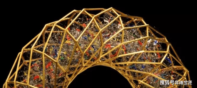 用黄金勾勒出镂空的手镯形状,里面则错落有致的镶嵌了数千根金属细丝。而整件作品最为独特之处就在于,每一根金属细丝上都镶嵌有不同颜色的珐琅。
