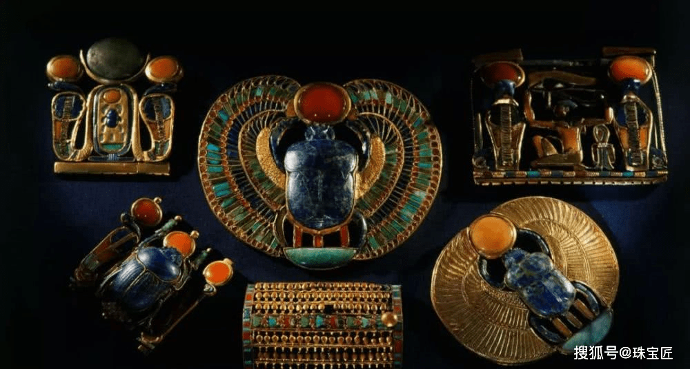 除了面具外,素有“法老的诅咒”之称的图坦卡蒙法老墓出过大量的青金石物品,包括青金石圣甲虫饰品等。