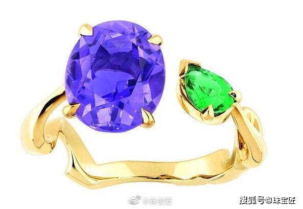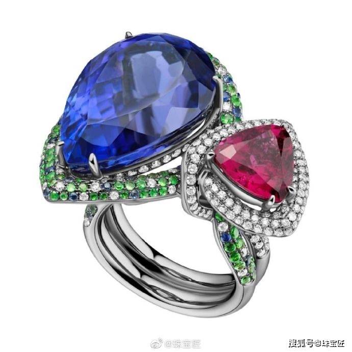 因为双石戒指的含义是代表两个相爱的灵魂,所以两颗主石的颜色往往是不同的,它也是“撞色珠宝”中的“中流砥柱”。