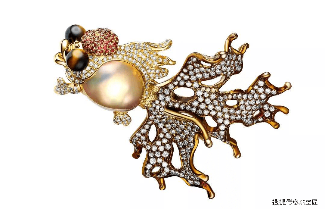 相对于上面奢华璀璨的鱼形珠宝,这款用巴洛克珍珠打造的鱼形胸针,则显得别出心裁,造型精巧可爱。