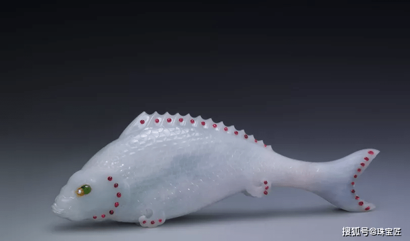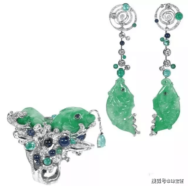 而另一款用翡翠打造的鱼形珠宝,搭配水滴的意境和镂空元素,精彩巧妙的设计,让人耳目一新。