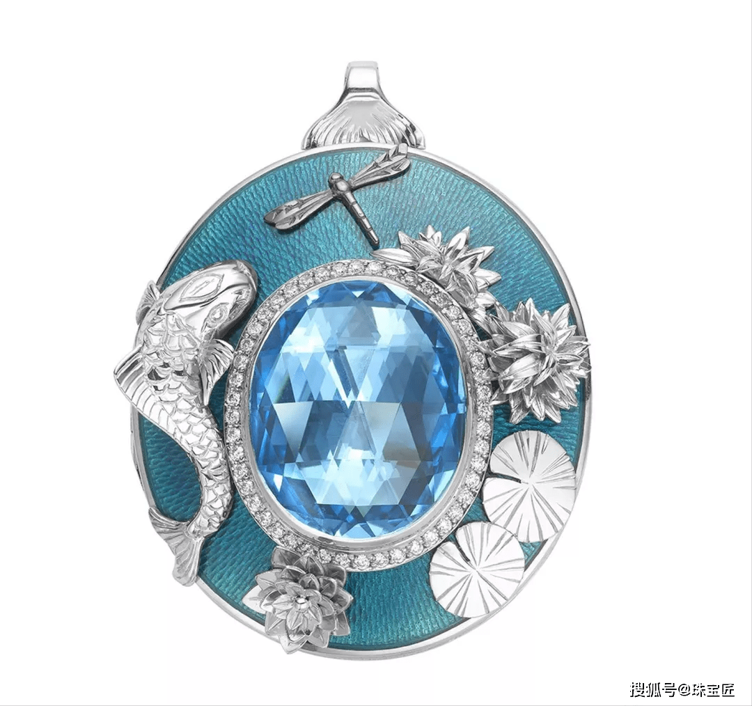 淡蓝色的珐琅上雕刻着18K白金的锦鲤、蜻蜓和荷叶,中间一颗硕大的蓝色托帕十分吸睛,整体的设计清幽淡雅,营造出一幅生机勃勃的荷塘美景。