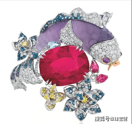 而华裔珠宝设计师Anna Hu设计的这件由各色彩宝镶嵌而成的锦鲤珠宝,配色丰富大胆,中间镶嵌的30.48ct的枕形切割红碧玺更是十分显眼,唯美浪漫。
