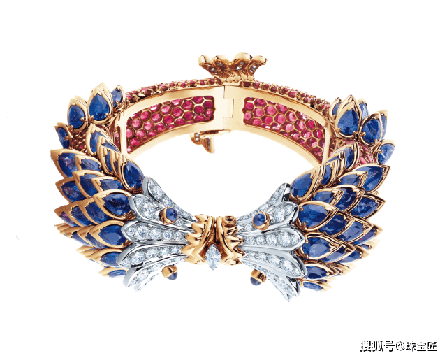 他秉持着一贯的华丽风格,蓝宝石、尖晶石、钻石的巧妙搭配,呈现出双鱼接吻的造型,色彩绚丽,造型夺目。