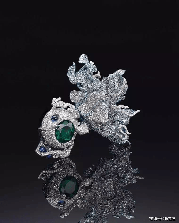钛金属铸造的鱼身上镶满钻石与蓝宝石,1颗31.18 克拉的哥伦比亚祖母绿镶嵌于金鱼的腮部,尾鳍的轮廓立体且灵动,营造出鱼儿在水中游动的意境。