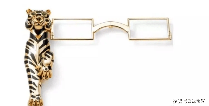 老虎为金质,身上嵌有黑色珐琅虎纹,铰链连接的眼镜可以向虎身合拢,设计十分精巧。