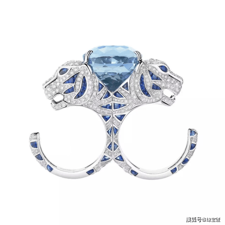 这枚极具建筑感的双虎头戒指,中间镶嵌的一颗19.22克拉的海蓝宝石,尽显高贵奢华。白与蓝的清新配色,一改以往虎的造型,整体的设计华贵闪耀。