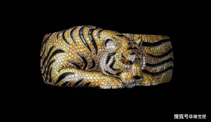 设计师 Anna Hu抓住猛虎向前扑的瞬间,彩宝与钻石镶嵌成色彩艳丽的虎身,虎尾自然弯曲,与虎爪连接成手镯,老虎口中衔着一颗重达3.59ct的钻石,璀璨闪耀。