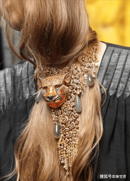火蛋白石与黑色钻石打造出威武勇猛的虎头,水滴形月光石与各色彩宝镶嵌的极致华丽的项链,尽显王者风范。