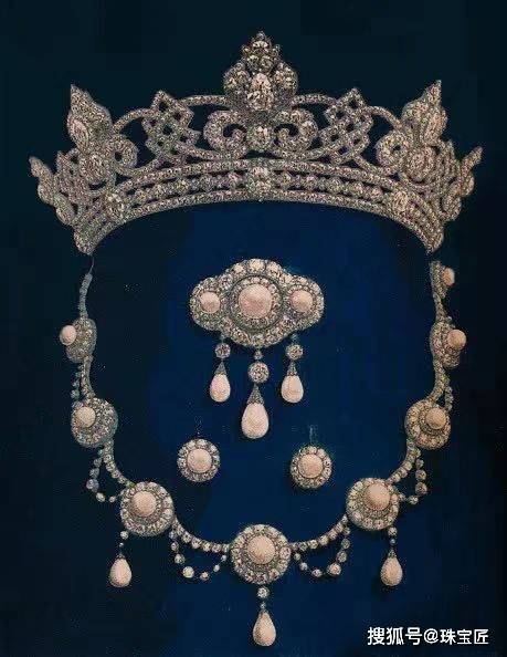 这个套装是由冠冕、项链、胸针、耳饰组成,温和圆润的珍珠镶嵌在闪耀夺目的钻石之上,极尽豪华。