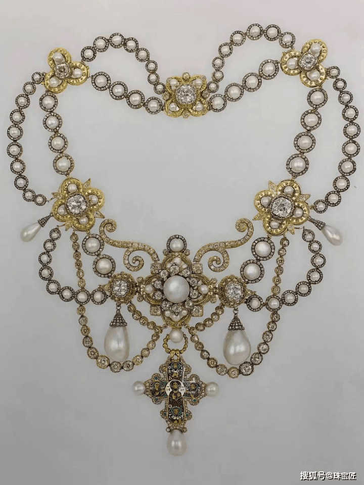 这条拜占庭风格的项链,是丹麦王室委托英国珠宝商Garrard制作完成,上面镶嵌了1000多颗钻石和100多颗珍珠。
