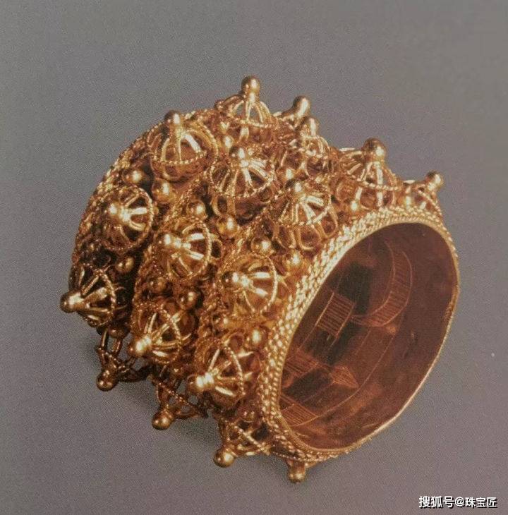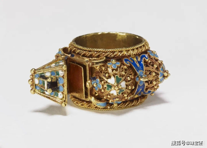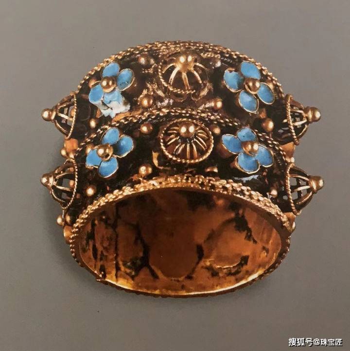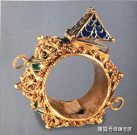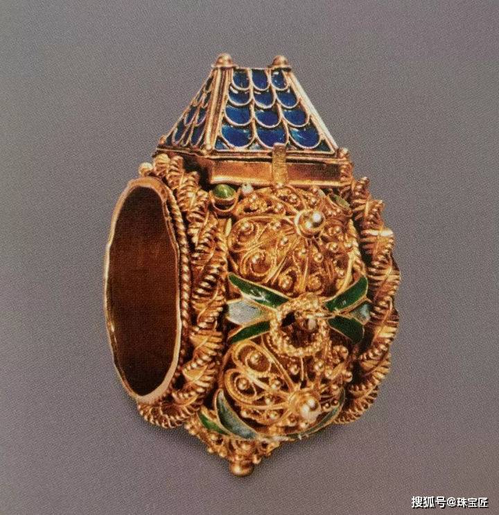 下面这枚公元18世纪或19世纪的犹太婚戒,指圈较宽,上面装饰用金丝、金珠和绿色珐琅。