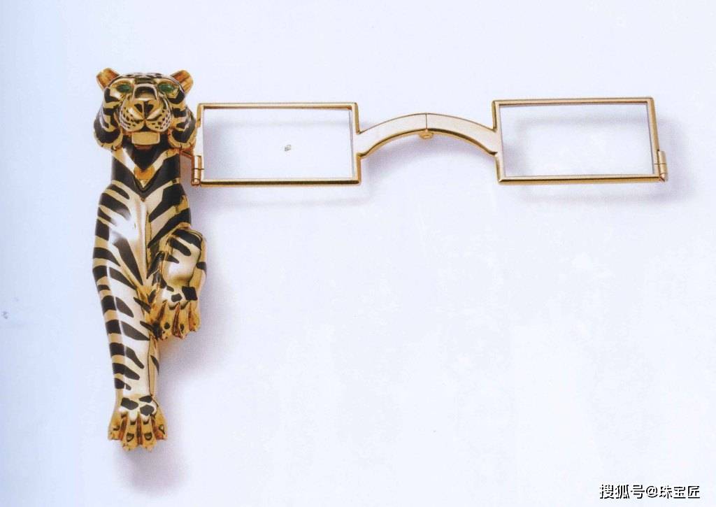 老虎为金质,身上嵌有黑色珐琅虎纹,虎眼则是用一对梨形祖母绿镶嵌而成,铰链连接的眼镜可以向虎身合拢,设计十分精巧。