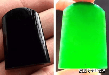 高品质的墨翠在普通光线下颜色乌黑,但在透光条件下,会呈现一种结构细腻通透的浓郁绿色(通常带蓝调),算是一种非常低调且高级的华丽。