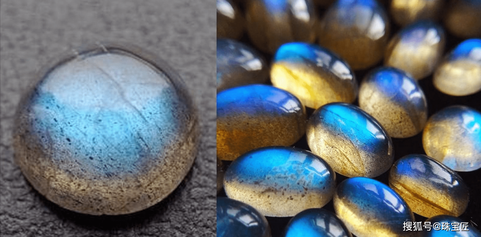 拉长石中的透明至半透明品种,多数呈淡灰至中灰体色,因其透明度高体色看起来较其它拉长石品种较浅,当它具有蓝色晕彩时,就会和月光石“神撞脸”,江湖人称“灰月光”。