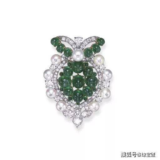 同为装饰艺术风格的还有下面这枚胸针,珍珠、钻石、祖母绿的巧妙结合,极尽奢华。