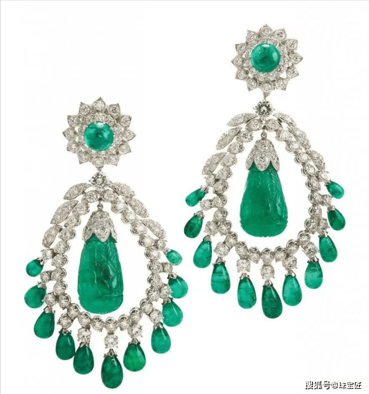 下面这对复古风十足的祖母绿钻石耳环,中间的一颗大克拉雕花祖母绿十分吸睛,钻石镶嵌而成的轮廓,以水滴形祖母绿作为点缀,尽显个性魅力。