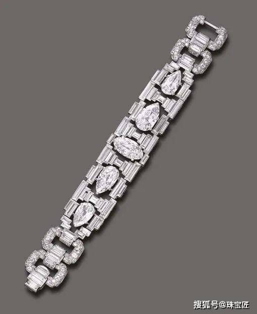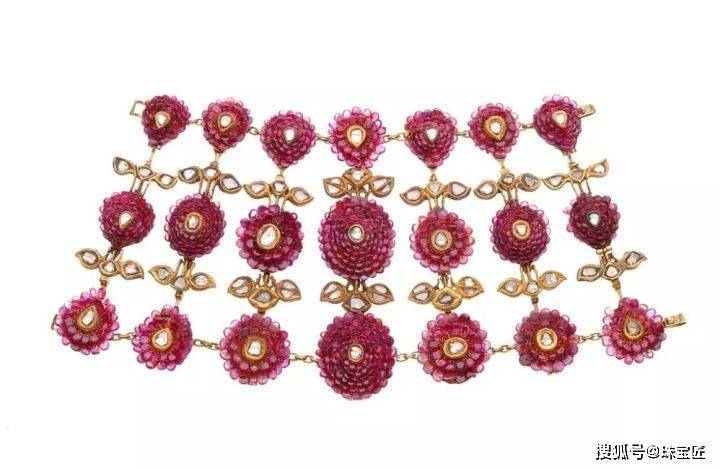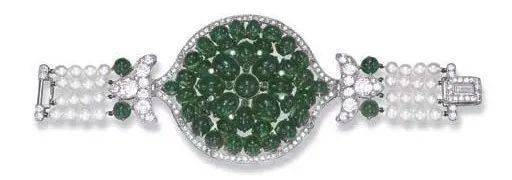 这条由钻石与祖母绿镶嵌而成的手链,是印度莫卧儿王朝时期的珠宝,呈现出典型的装饰艺术风格,中间由大小不一的祖母绿镶嵌而成的圆环,造型独特,十分夺目。