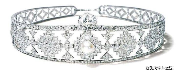 这顶卡地亚珍珠钻石冠冕,框架为铂金材质,并选用钻石进行点缀,中间一颗巨大的天然珍珠和2颗硕大的钻石成为整个设计的亮点,镂空的设计,巧妙灵动。