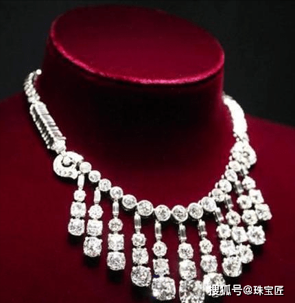 下面这条钻石项链,出自卡地亚之手,11颗采用不同切割的大克拉钻石,悬挂于镶嵌234颗璀璨钻石的项链之上,流苏的设计更显时尚高贵。