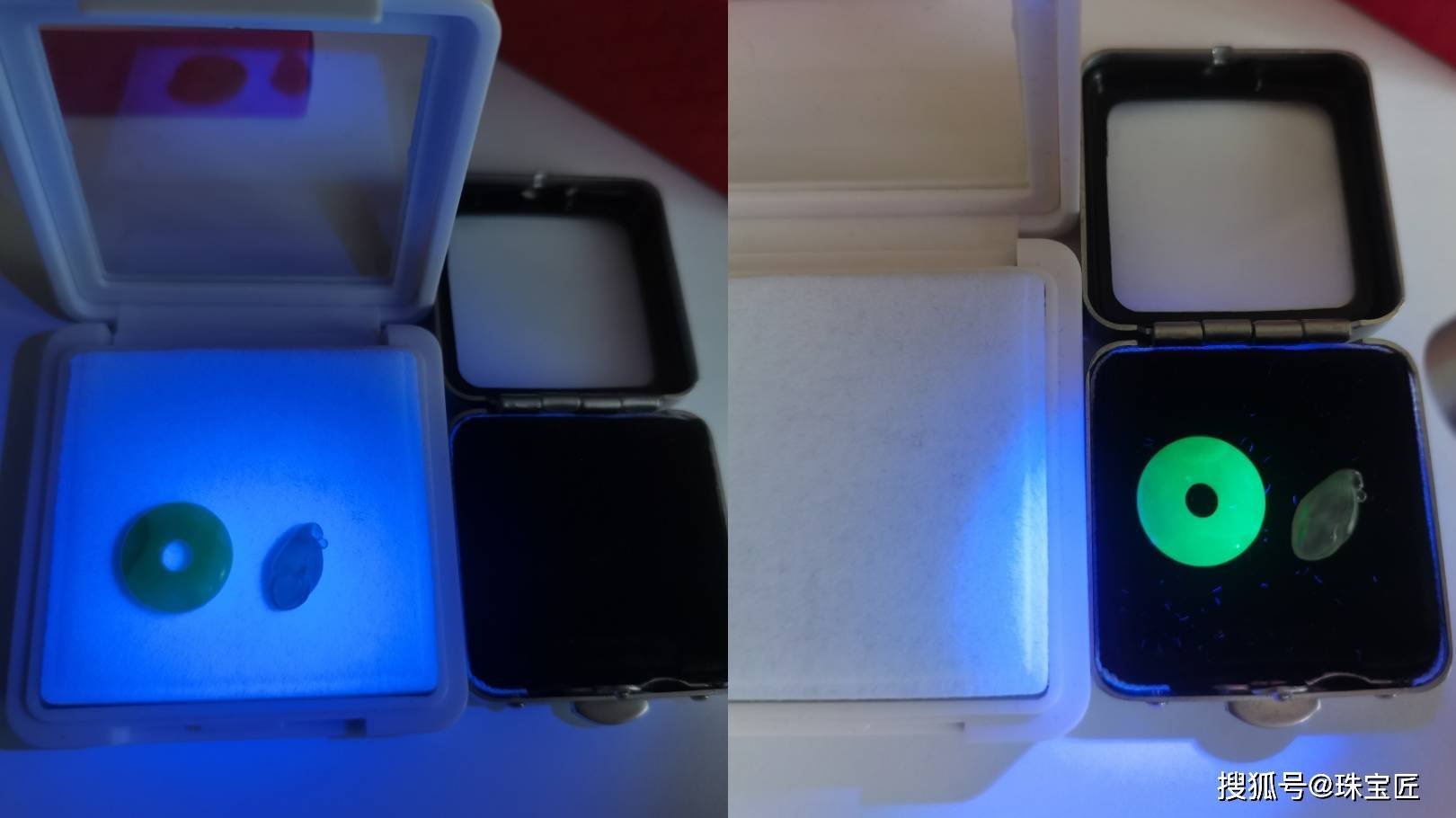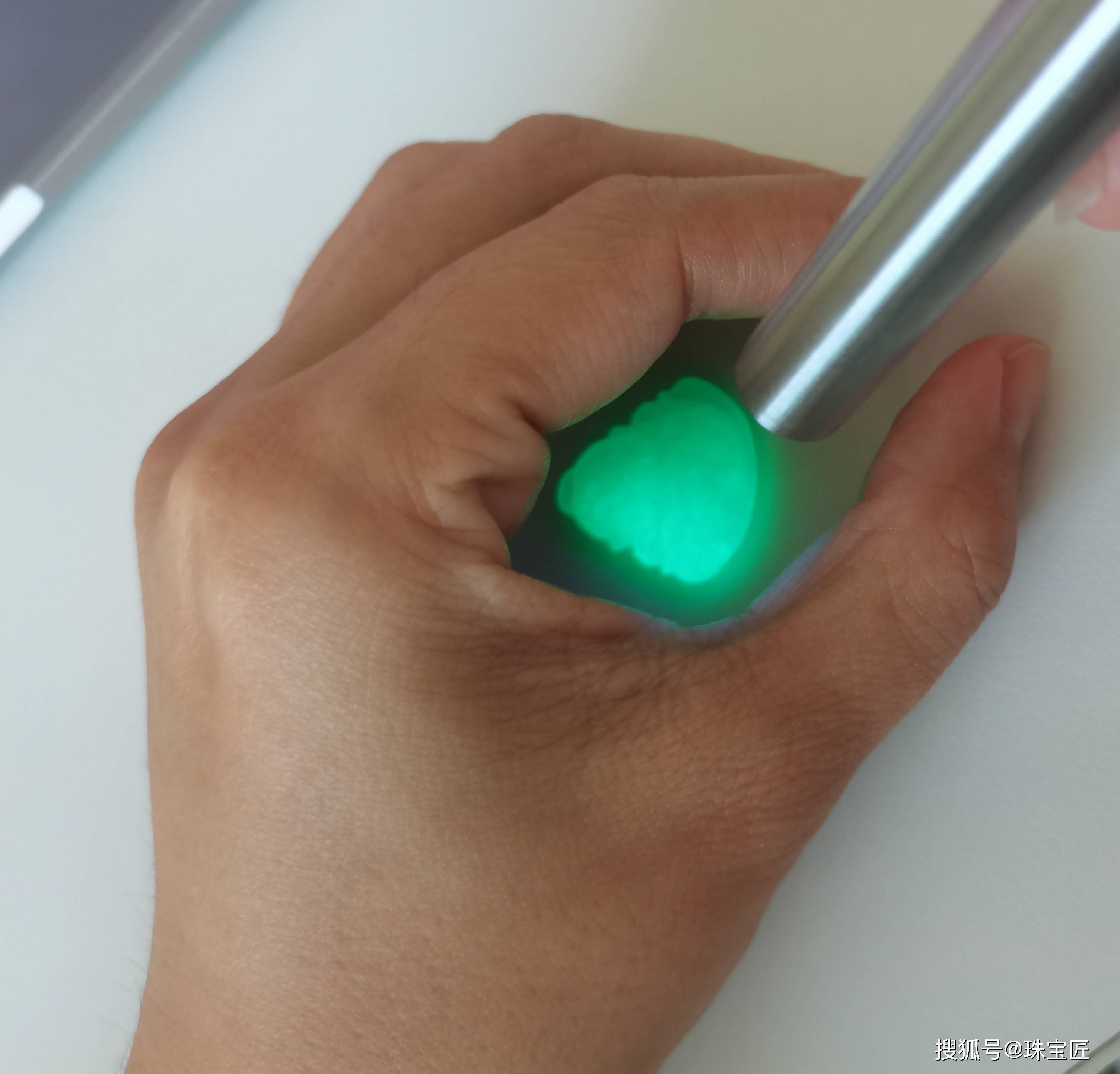 所以,如果使用便携的紫外荧光手电,要尽量选择关灯或者背光暗域环境,比如拿手笼在待观测的珠宝上方,形成一个小的暗室,再进行打灯观察。