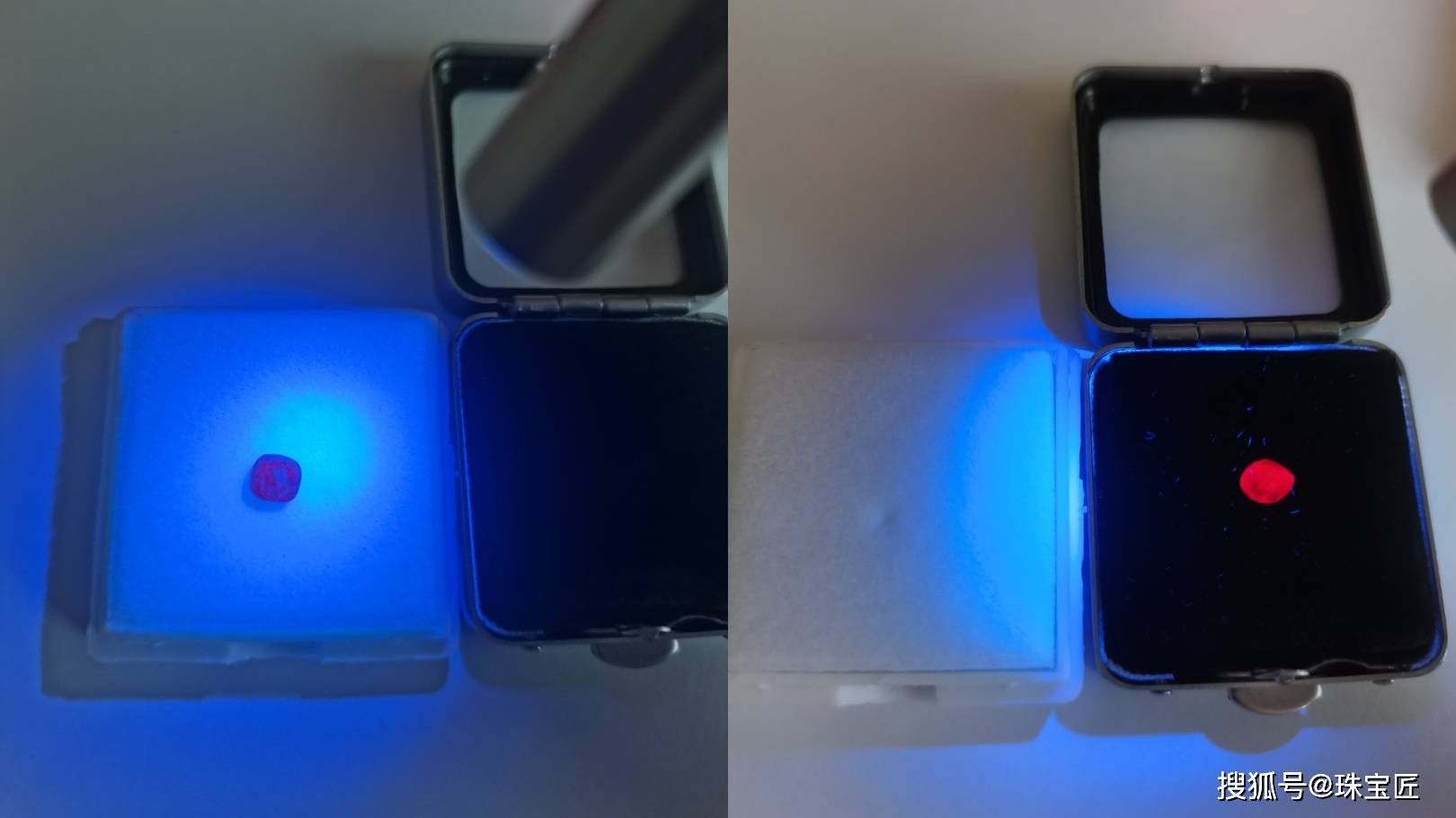 同一颗绝地武士尖晶在不同背景下打365紫外荧光;图源:珠宝匠实拍