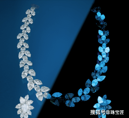 紫外灯除了在区分天然钻石荧光强弱,还能在不明真假的群镶“碎钻”首饰中起到辅助鉴定作用——若群镶碎钻都为天然钻石,其荧光发光强度和颜色不会均匀,而合成立方氧化锆、人造钇铝榴石等,其荧光强度则较为一致。