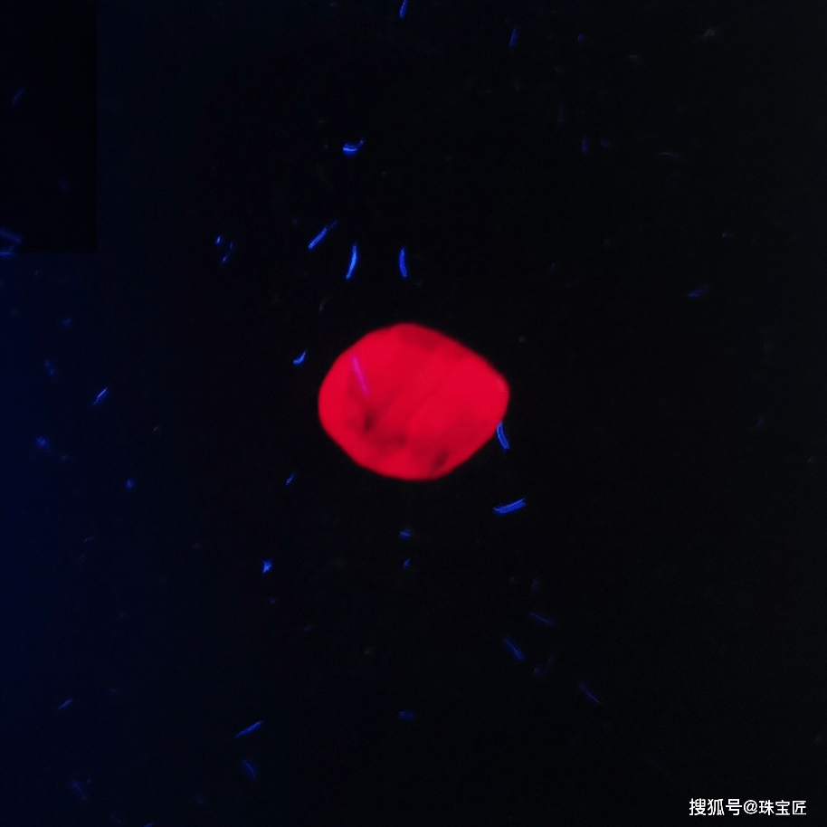天然红宝石由于含有微量的Fe元素,在紫外灯下荧光颜色不如合成品鲜艳明亮。