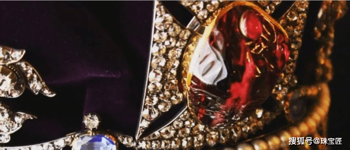 正中间的十字花雕饰上,镶嵌的则是大名鼎鼎的“黑王子”红宝石。