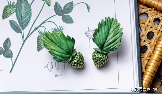 尤其是下面这枚草莓耳坠,阳极氧化铝打造的绿叶自然逼真,采用倒置镶嵌的钙铁榴石生动夺目,富有生机。