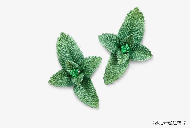 而这枚迷迭香耳钉,铜与白金打造的绿叶迎风舞动,中间镶嵌的一颗硕大的坦桑石成为设计的点睛之笔,堪称抽象与现实的完美结合。