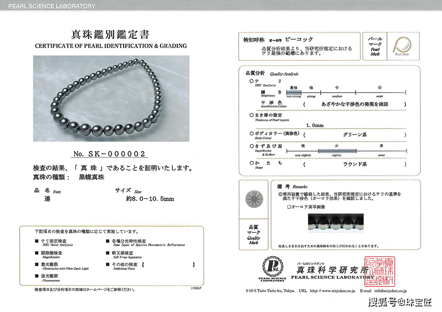 SJ型证书是上面SK型证书的简化版,同样是适用于达到最强光辉品质的珍珠,区别在于检测内容有删减。